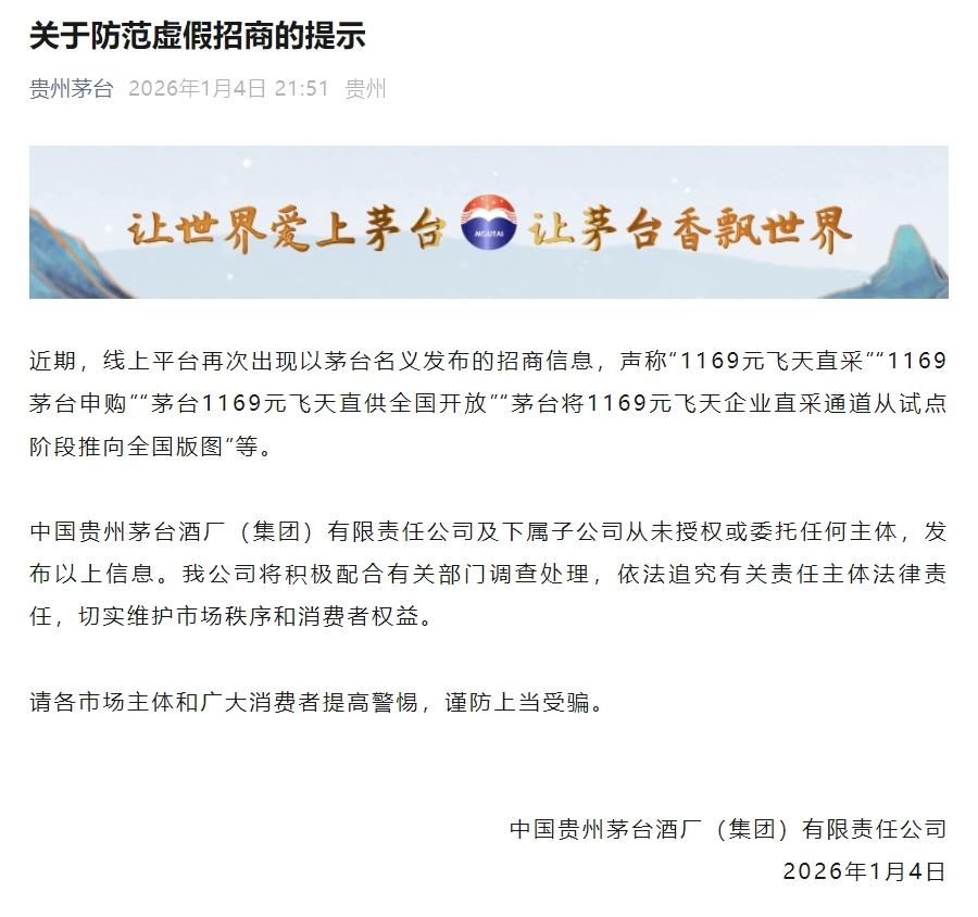 1月4日晚,茅臺集團發(fā)布關(guān)于防范虛假招商的提示:近期,線上平臺再次出現(xiàn)以茅臺名義發(fā)布的招商信息,聲稱“1169元飛天直采”“1169茅臺申購”“茅臺1169元飛天直供全國開放”“茅臺將1169元飛天企業(yè)直采通道從試點階段推向全國版圖”等。
