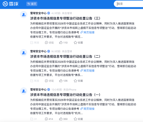 “對違規(guī)賬號,將依法依約采取警示、刪除違規(guī)內(nèi)容、禁言、關(guān)閉賬號等處置措施。”雪球方面稱。