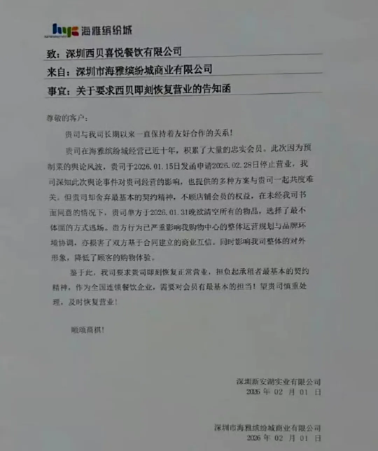 該告知函顯示,因?yàn)轭A(yù)制菜的輿論風(fēng)波,西貝喜悅餐飲于2026年1月15日向海雅繽紛城發(fā)函,申請(qǐng)2026年2月28日停止?fàn)I業(yè)。為一起度過(guò)難關(guān),該商城提供了多種方案給西貝喜悅餐飲。但“在未經(jīng)我司書(shū)面同意的情況下,貴司單方于2026年1月31日晚欲清空所有的物品,選擇了最不體面的方式逃場(chǎng)”。界面新聞注意到,該告知函沒(méi)有蓋章。