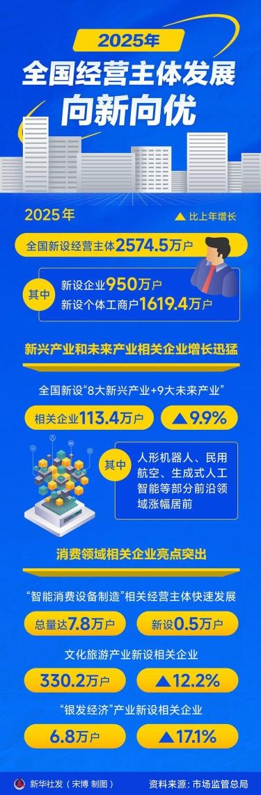 新華社北京2月26日電(記者王悅陽)記者2月26日從市場監(jiān)管總局獲悉,2025年全國新設(shè)經(jīng)營主體2574.5萬戶。其中,新設(shè)企業(yè)950萬戶,新設(shè)個體工商戶1619.4萬戶。經(jīng)營主體呈現(xiàn)向新向優(yōu)發(fā)展態(tài)勢,為高質(zhì)量發(fā)展蓄勢聚能。