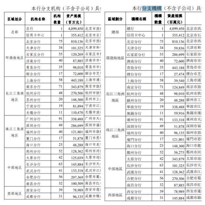 中新網(wǎng)記者對(duì)比兩份公告發(fā)現(xiàn),除北京分行、西安分行、悉尼分行、澳門分行等少數(shù)分支機(jī)構(gòu)數(shù)據(jù)一致外,40家分支機(jī)構(gòu)的資產(chǎn)規(guī)模出現(xiàn)較大出入。