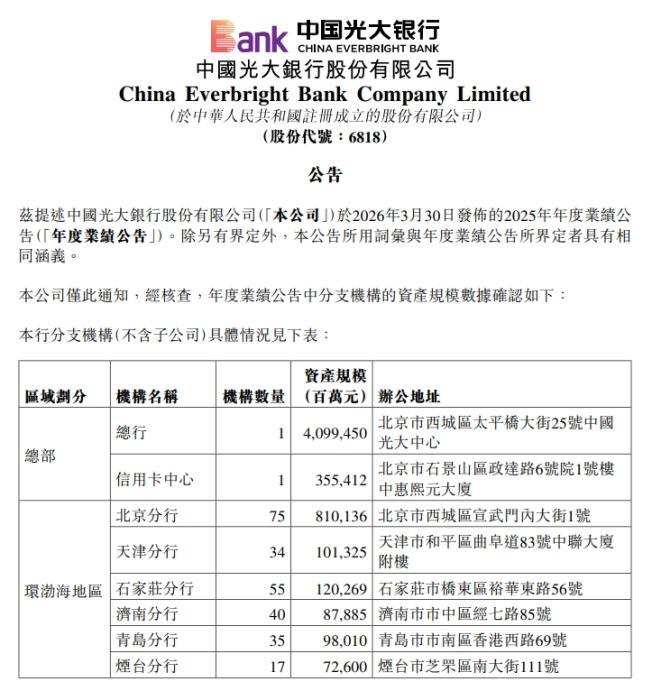 4月1日晚,光大銀行在港交所發(fā)布公告,對(duì)分支機(jī)構(gòu)的資產(chǎn)規(guī)模數(shù)進(jìn)行了確認(rèn)。從公告發(fā)布數(shù)據(jù)來(lái)看,光大銀行對(duì)之前在港交所披露的數(shù)據(jù)進(jìn)行了變更,變更后的數(shù)據(jù)與上交所發(fā)布的2025年年報(bào)數(shù)據(jù)保持一致。