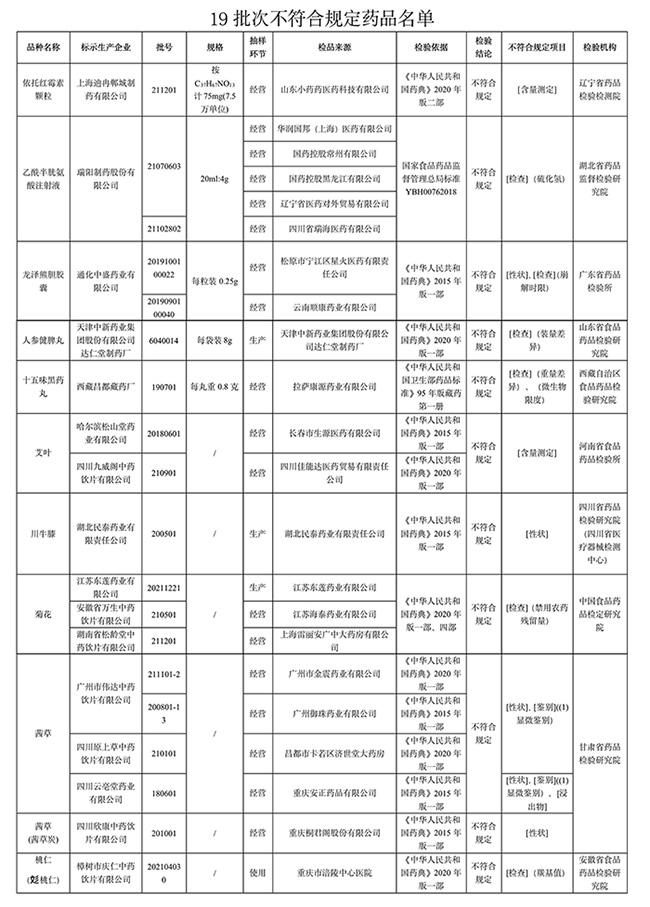 國(guó)家藥監(jiān)局表示,對(duì)上述不符合規(guī)定藥品,藥品監(jiān)督管理部門已要求相關(guān)企業(yè)和單位采取暫停銷售使用、召回等風(fēng)險(xiǎn)控制措施,對(duì)不符合規(guī)定原因開(kāi)展調(diào)查并切實(shí)進(jìn)行整改。