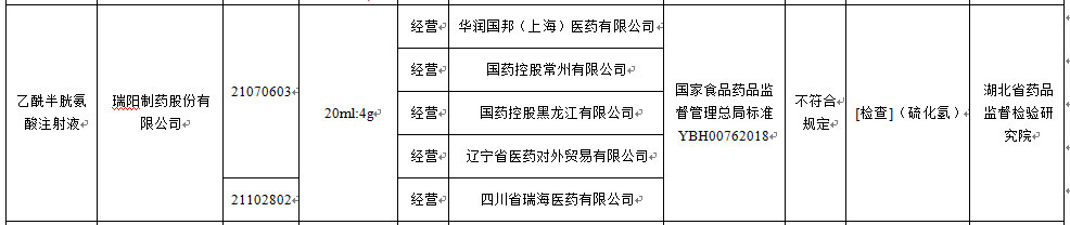 通告顯示,經(jīng)湖北省藥品監(jiān)督檢驗(yàn)研究院檢驗(yàn),標(biāo)示為瑞陽制藥股份有限公司生產(chǎn)的2批次乙酰半胱氨酸注射液(批號:21070603、21102802)不符合規(guī)定,不符合規(guī)定項(xiàng)目為硫化氫。