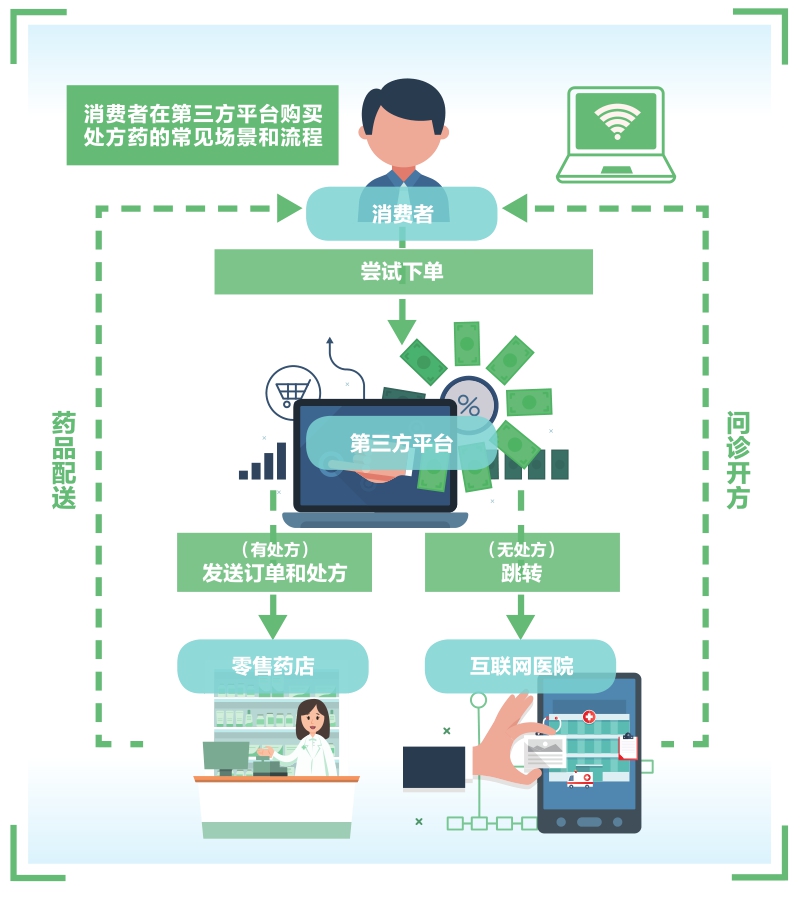 通常而言,消費(fèi)者在第三方平臺(tái)購(gòu)買處方藥的場(chǎng)景和流程如上圖。