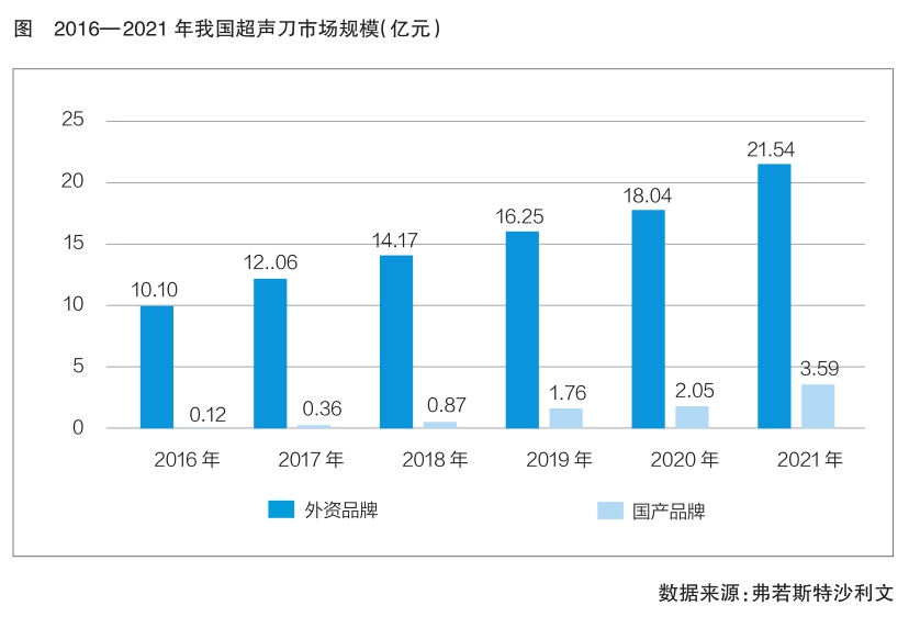 弗若斯特沙利文數(shù)據(jù)還顯示,我國超聲刀市場規(guī)模已從2016年的10.22億元增長至2021年的25.13億元,年復(fù)合增長率高達(dá)19.71%;其中,國產(chǎn)品牌市場規(guī)模增速較快,已從2016年的0.12億元增長至2021年的3.59億元(詳見圖)。