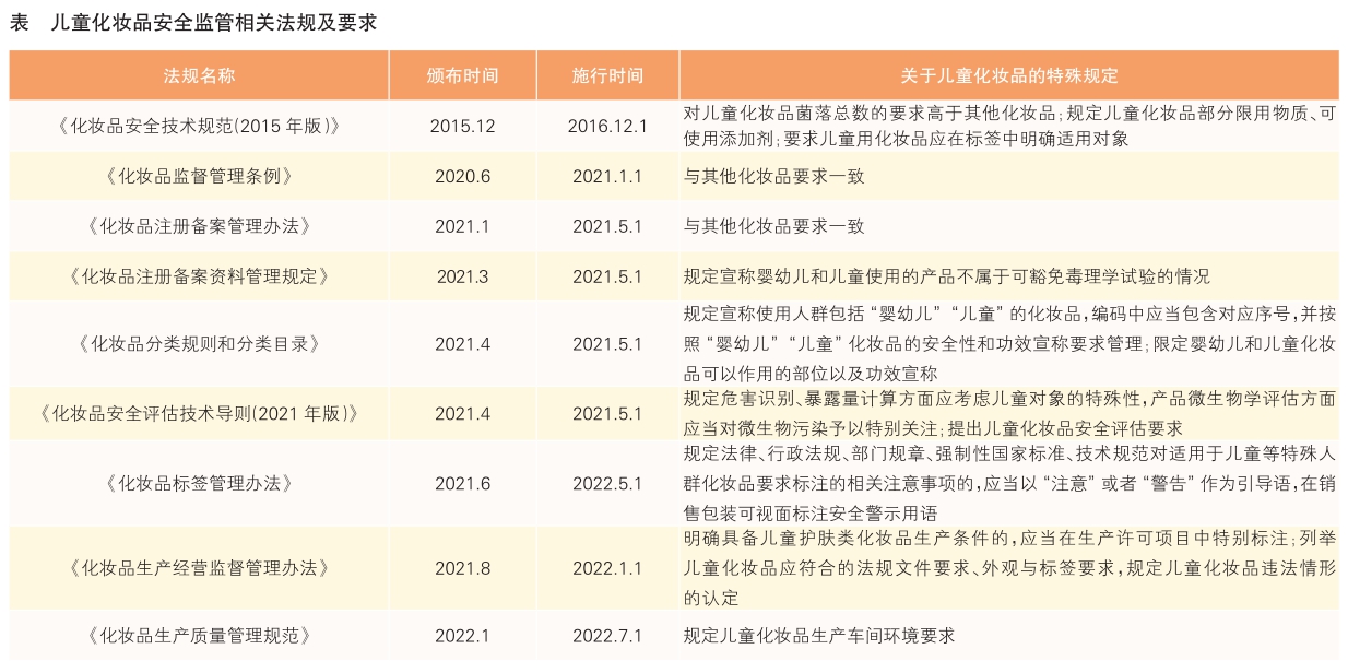 《化妝品監(jiān)督管理?xiàng)l例》自2021年1月1日起施行后,配套法規(guī)文件密集發(fā)布,兒童化妝品安全監(jiān)管法規(guī)體系加快完善。