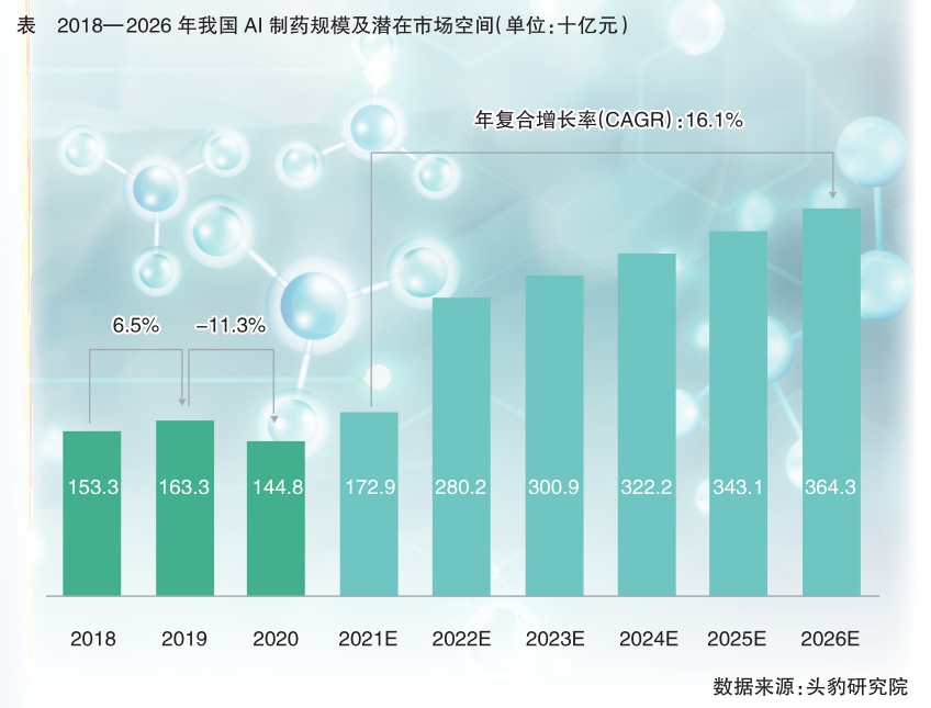 AI制藥的市場增速和空間與創(chuàng)新藥市場占比、AI技術(shù)迭代升級都息息相關(guān)。頭豹研究院預(yù)計,根據(jù)目前我國醫(yī)藥市場情況,以及AI制藥各市場主體的在研項目情況,未來創(chuàng)新藥市場占整體醫(yī)藥市場的比例或?qū)⑦_到15%;預(yù)計我國AI制藥在2021—2026年期間的年復(fù)合增長率(CAGR)為16.1%,2026年的潛在市場空間將達到3643億元。