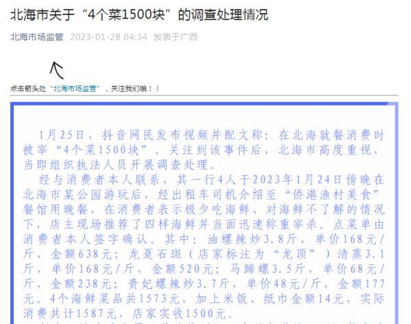 1月28日,廣西北海市市場(chǎng)監(jiān)督管理局微信公眾號(hào)發(fā)布《北海市關(guān)于“4個(gè)菜1500塊”的調(diào)查處理情況》,其中提到: