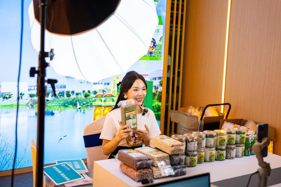 9月15日,在長沙國際會展中心,參展商通過直播推銷雜糧。