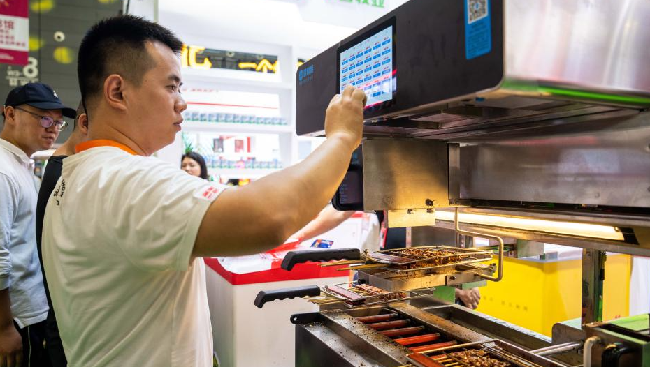 9月15日,在長沙國際會展中心,參展商在展示自動燒烤機操作方法。