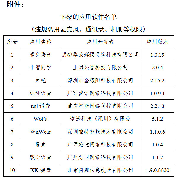 通報(bào)顯示,截至目前,經(jīng)第三方檢測(cè)機(jī)構(gòu)核查復(fù)檢,尚有10款A(yù)PP未按照工業(yè)和信息化部要求完成整改(詳見附件)。