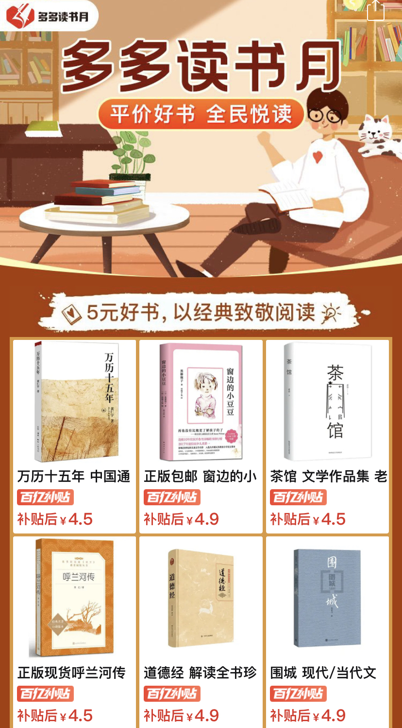 業(yè)內(nèi)人士指出,這是拼多多迄今開展的最大規(guī)?!爸R(shí)普惠行動(dòng)”?!霸谶^去的一年中,圖書行業(yè)電商滲透率已接近60%,但仍有大量新興閱讀群體的需求未被充分滿足。”“多多讀書月”負(fù)責(zé)人表示,此次活動(dòng)不設(shè)滿減、發(fā)券門檻,不用比價(jià),直接補(bǔ)貼,以進(jìn)一步降低閱讀門檻,推動(dòng)知識(shí)普惠,讓更多“拼書人”切實(shí)享受閱讀的快樂。此外,在“多多讀書月”期間,平臺(tái)將持續(xù)聯(lián)合各大出版社,不斷更新補(bǔ)貼書目,同時(shí)協(xié)調(diào)物流保障等,為廣大讀者提供優(yōu)質(zhì)的服務(wù)。
