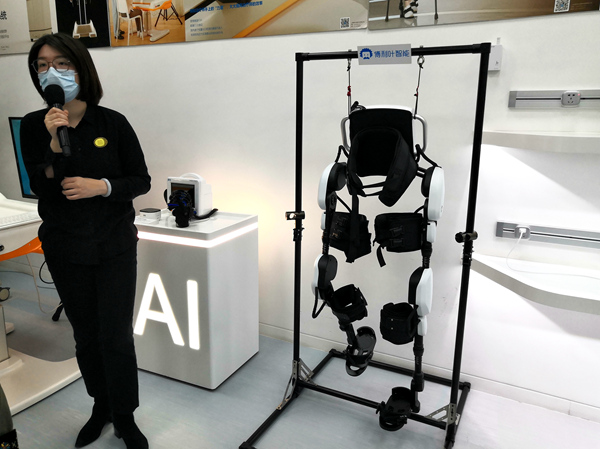 張江人工智能島AI體驗(yàn)中心工作人員為記者講解人工智能在醫(yī)療方面的應(yīng)用,圖為下肢外骨骼康復(fù)機(jī)器人。人民網(wǎng)記者 孫博洋攝
