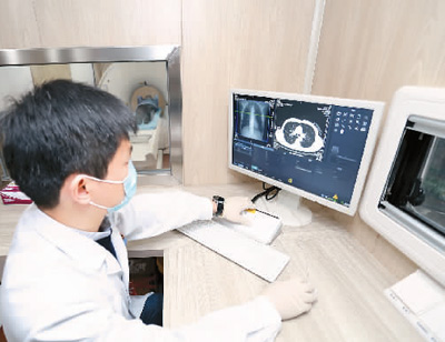 “肺癌早篩車”配備車載低劑量CT機(jī)、智能AI輔助讀片和5G技術(shù),讓被篩者可在車上接受CT檢查。圖為浙江省紹興市中心醫(yī)院醫(yī)共體總院放射、胸外、呼吸、腫瘤等科室專家來到安昌分院,為當(dāng)?shù)鼐用耖_展肺癌篩查。 |