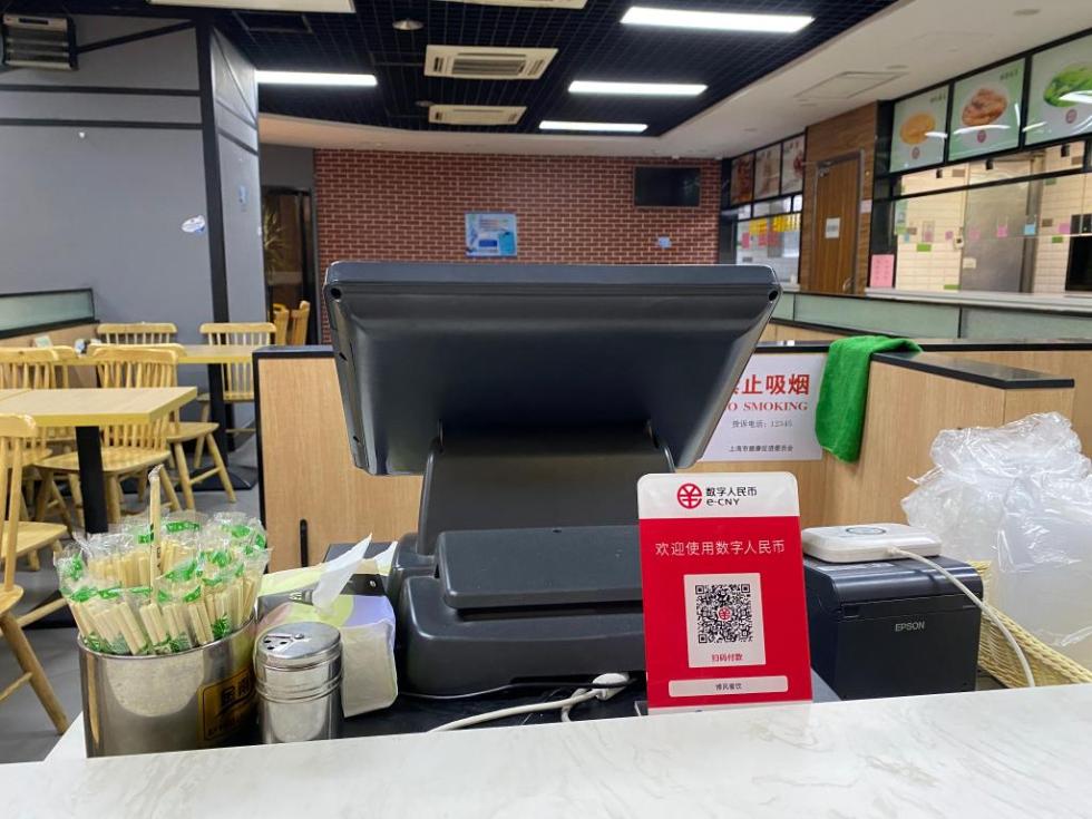 上海靜安區(qū)博風(fēng)白領(lǐng)食堂在收銀臺上擺出了“數(shù)字人民幣”標(biāo)牌,新華社記者 王淑娟 攝