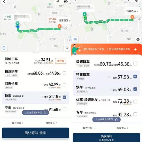 ——記者在某網約車平臺上搜索發(fā)現(xiàn),在同一時間于同一地點出發(fā)至北京西站,經常使用該網約車平臺的用戶手機內顯示的快車打車費用預估為69.03元。但不經常使用該平臺的用戶手機上顯示,打車費用預計為51.18元,其中包含了17.05元被抵扣的優(yōu)惠券。但記者發(fā)現(xiàn),即便不選擇使用優(yōu)惠券抵扣車費,不經常使用該平臺的用戶打車費用是68.23元,比常用用戶顯示的車費還便宜0.8元。