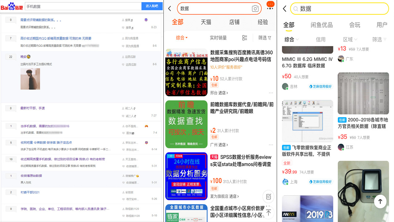 灰色數(shù)據(jù)交易藏匿于百度貼吧、淘寶、閑魚(yú)等平臺(tái)。