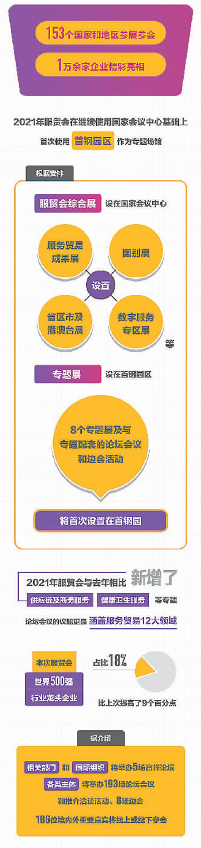 在去年“綜合+專題”“線上+線下”“室內(nèi)+室外”的基礎上,今年創(chuàng)新了“一會兩館”辦會新空間。5場高峰論壇、193場論壇會議和推介洽談活動以及8場邊會將舉辦,8個專題展及與專題配套的論壇會議和邊會活動將首次設置在首鋼園。