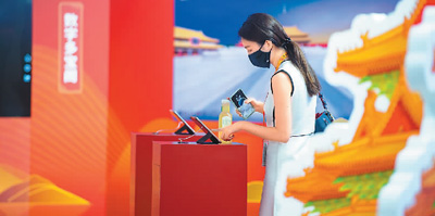 在由故宮博物院主辦、騰訊協(xié)辦的“文化傳承·數(shù)字共享”數(shù)字故宮體驗專區(qū),推出了“數(shù)字文物”“數(shù)字考古”“數(shù)字服務”三大板塊,全方位展示了故宮20多年來的數(shù)字化成果。圖為9月1日,國家會議中心展館內(nèi),與會人員在體驗故宮博物院的創(chuàng)意設備。 |