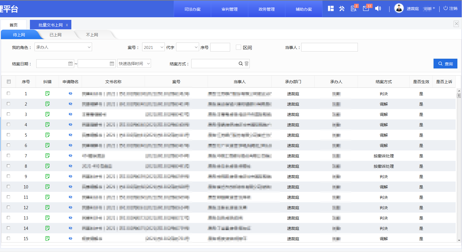 開發(fā)速裁快審系統(tǒng),支持批量案件流程事項的批量辦理,如批量審判組織設置、排期、扣除審限、報結案、移送上訴等,大大簡化了操作,提高工作效率,系統(tǒng)模塊化嵌入法綜系統(tǒng),用戶體驗好,操作簡便實用。為實現(xiàn)法官對簡案的快速辦理,將法官常用個案辦理功能放入“快捷辦理”列表中,并集成智能閱卷、文書制作、司法送達等智能卷宗功能,無須進入個案辦理頁面即可直接進行相關流程的辦理,簡化操作。