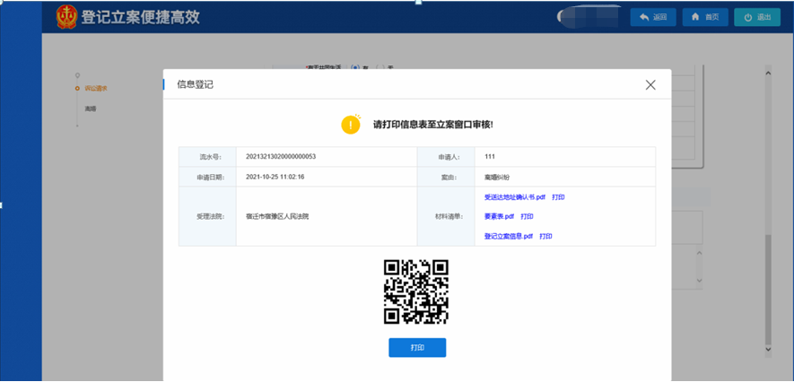 登記完成后生成二維碼,移送立案。自助登記操作平均只需幾分鐘即可完成。立案窗口通過掃描二維碼自動關聯(lián)登記信息,自動回填數(shù)據(jù)到立案系統(tǒng),審核完畢后立案。通過立案信息登記前置和當事人自助登記填單有效提升了立案信息的準確率和可用性,同時,將立案流程一分為二,大大縮短了立案時間,讓當事人從被動的等待變?yōu)橹鲃拥膮⑴c,有效緩解當事人因長時間排隊等待立案產(chǎn)生的焦躁情緒。