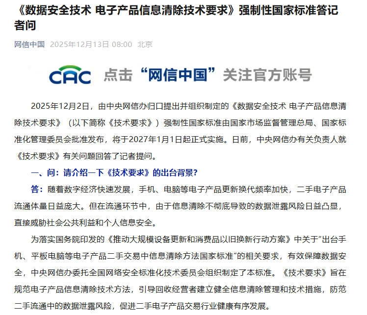 2025年12月2日,由中央網(wǎng)信辦歸口提出并組織制定的《數(shù)據(jù)安全技術(shù) 電子產(chǎn)品信息清除技術(shù)要求》(以下簡(jiǎn)稱《技術(shù)要求》)強(qiáng)制性國(guó)家標(biāo)準(zhǔn)由國(guó)家市場(chǎng)監(jiān)督管理總局、國(guó)家標(biāo)準(zhǔn)化管理委員會(huì)批準(zhǔn)發(fā)布,將于2027年1月1日起正式實(shí)施。日前,中央網(wǎng)信辦有關(guān)負(fù)責(zé)人就《技術(shù)要求》有關(guān)問(wèn)題回答了記者提問(wèn)。