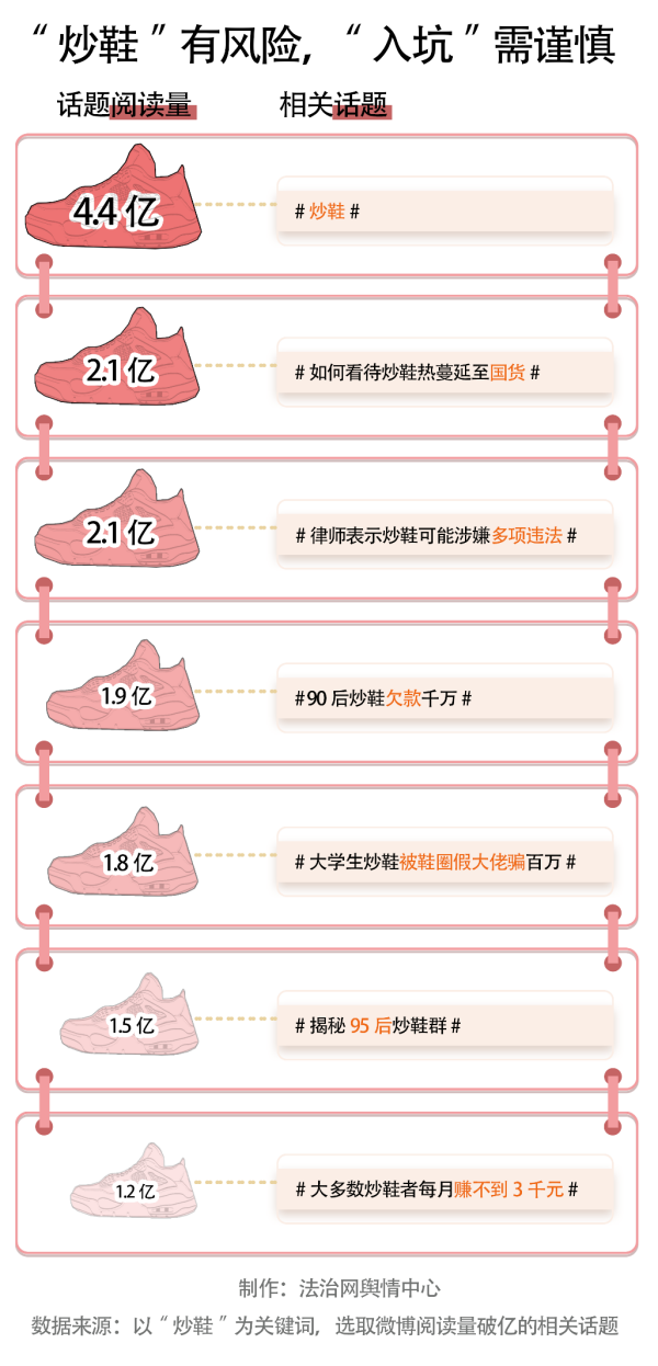 微博話(huà)題“揭秘95后炒鞋群”的相關(guān)閱讀量達(dá)到了1.9億,其中,有些95后炒鞋者靠“炒鞋”一夜暴富,也有不少炒鞋者虧得血本無(wú)歸,甚至有炒鞋者卷入經(jīng)濟(jì)糾紛或涉嫌違法。