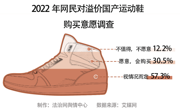 從艾媒網(wǎng)公布的數(shù)據(jù)來(lái)看,30.5%的消費(fèi)者表示,無(wú)論國(guó)產(chǎn)運(yùn)動(dòng)鞋溢價(jià)多少都愿意購(gòu)買(mǎi),57.3%的消費(fèi)者稱(chēng)會(huì)視溢價(jià)情況而定,12.2%的消費(fèi)者表示不會(huì)購(gòu)買(mǎi)國(guó)產(chǎn)溢價(jià)運(yùn)動(dòng)鞋。