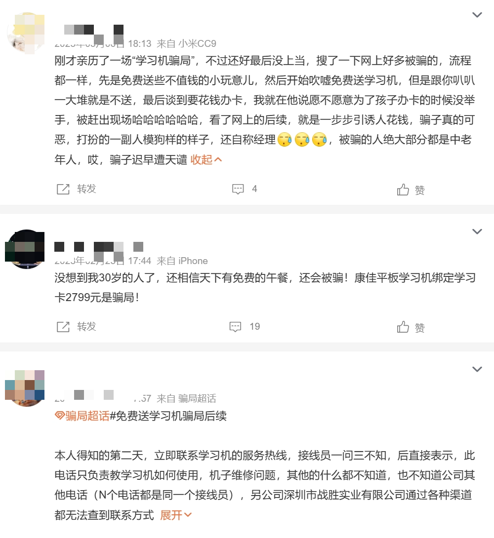 記者搜索發(fā)現(xiàn),這類以免費送學(xué)習(xí)機、學(xué)習(xí)平板為幌子,捆綁銷售高價課程的誘騙式消費不在少數(shù),僅黑貓投訴關(guān)于“學(xué)習(xí)機騙局”的投訴就高達380余條,其中大部分都是采用上述套路。