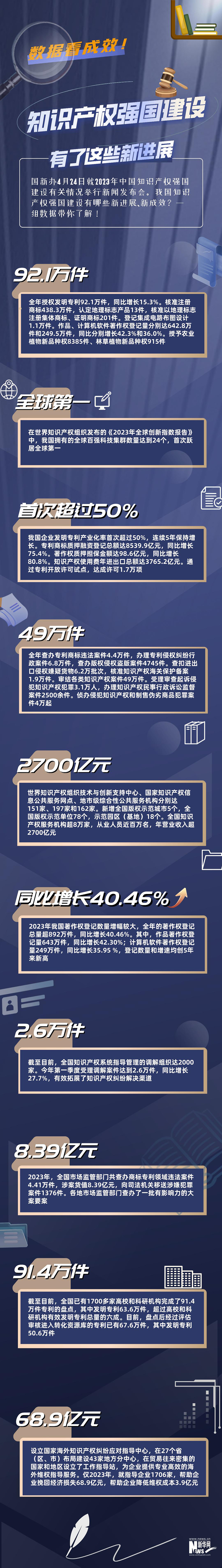 國新辦4月24日就2023年中國知識(shí)產(chǎn)權(quán)強(qiáng)國建設(shè)有關(guān)情況舉行新聞發(fā)布會(huì)。我國知識(shí)產(chǎn)權(quán)強(qiáng)國建設(shè)有哪些新進(jìn)展、新成效?一組數(shù)據(jù)帶你了解!