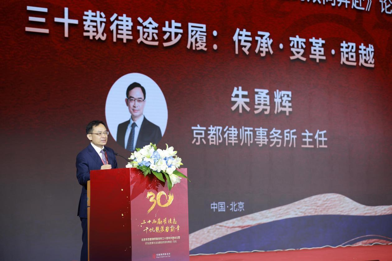 京都律師事務所主任朱勇輝在致辭中表示,在京都所三十歲生日這個特別的日子里,與會人員共同關注中國律師的成長,共同關心中國律師行業(yè)的發(fā)展,共同關切中國法治的進步。希望在探討中國律所四十載旅途步履,聚焦中國律師行業(yè)變革的同時,能夠總結中國律所發(fā)展的經(jīng)驗與路徑,讓律師為國家法治建設作出更大貢獻。