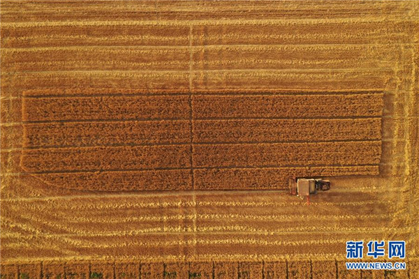 6月13日,雄安新區(qū)大王鎮(zhèn)小王村村民在收獲小麥(無人機拍攝)。 近日,雄安新區(qū)小麥陸續(xù)成熟,當?shù)卮迕駬屪マr(nóng)時進行收獲。 新華社記者 邢廣利 攝