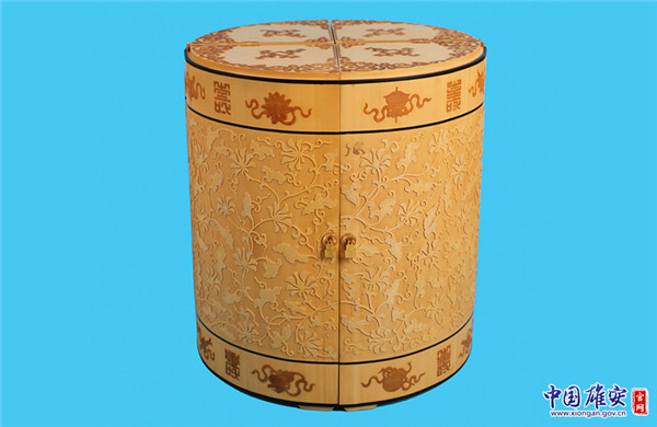 王樂修介紹,竹簧的制作是一種非常復雜的工藝,往往需要十幾道工序。竹簧的材料是用毛竹、楠竹,去其外皮,刮去竹肉,留下毫米左右的竹內(nèi)層叫竹簧,將其竹簧片曬干后粘貼在各種形狀的木胎上,雕刻出花紋圖案。竹簧工藝打破了竹子原材料的局限性,可方、可圓、可扁,器物完美。作品突出了傳統(tǒng)宮廷吉祥紋飾,融入了傳統(tǒng)文化韻味,雕刻精細,栩栩如生。