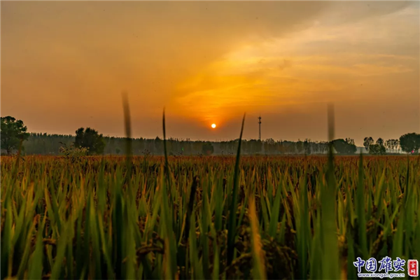 白洋淀碼頭附近,夕陽(yáng)映著稻田,一派和諧靜謐的景象。中國(guó)雄安官網(wǎng)毛鶴然 攝