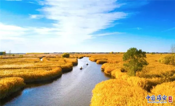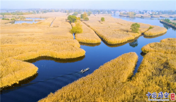 深秋時(shí)節(jié)的白洋淀旁,大片水稻成熟,滿目金黃。中國(guó)雄安官網(wǎng)毛鶴然 攝