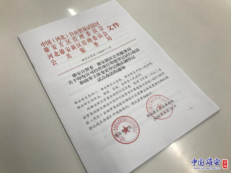 《中國(河北)自由貿(mào)易試驗區(qū)雄安片區(qū)許可經(jīng)營項目籌建登記辦法(試行)》《中國(河北)自由貿(mào)易試驗區(qū)雄安片區(qū)商事主體變更登記確認(rèn)制登記試點辦法》印發(fā)。中國雄安官網(wǎng)記者毛鶴然 攝