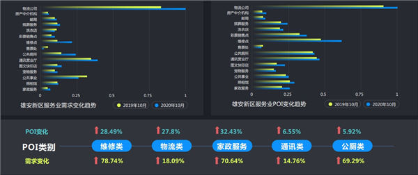 家政、通訊、公廁等POI數(shù)量則分別增長(zhǎng)了32.43%、6.55%、5.92%。這些從側(cè)面反映出,雄安新區(qū)建設(shè)大軍的涌入,帶動(dòng)了當(dāng)?shù)叵M(fèi)需求的增長(zhǎng)和消費(fèi)能力的提升。