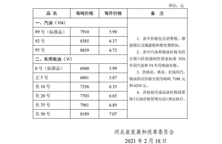 2月18日,河北省發(fā)展和改革委員會(huì)發(fā)布《關(guān)于調(diào)整我省成品油價(jià)格的公告》。根據(jù)現(xiàn)行成品油價(jià)格形成機(jī)制,自2021年2月18日24時(shí)起,河北省汽、柴油價(jià)格(標(biāo)準(zhǔn)品)每噸分別提高275元、265元,調(diào)整后的汽、柴油最高零售價(jià)格見下表。乙醇汽油價(jià)格按同標(biāo)號(hào)汽油(VIA)價(jià)格執(zhí)行,普通柴油價(jià)格按照同標(biāo)號(hào)車用柴油(VI)價(jià)格執(zhí)行,98號(hào)汽油價(jià)格由成品油生產(chǎn)經(jīng)營企業(yè)根據(jù)市場情況自主制定具體價(jià)格。(河北日?qǐng)?bào)記者潘文靜)