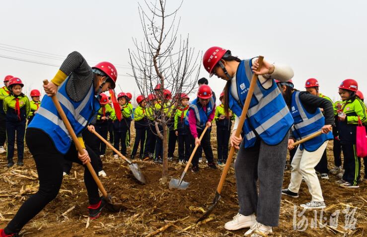 2021年3月11日,“千年秀林”管護(hù)人員與容城縣賈光鄉(xiāng)東張楚小學(xué)的學(xué)生們一起種下“雄安樹”。