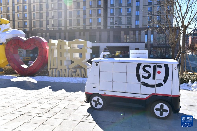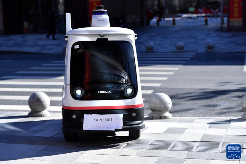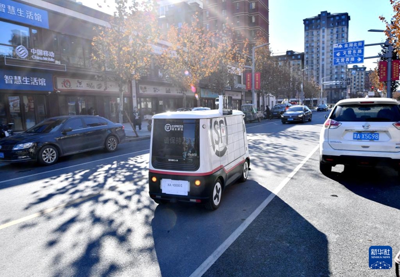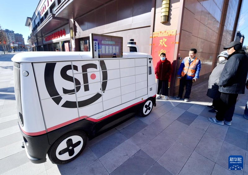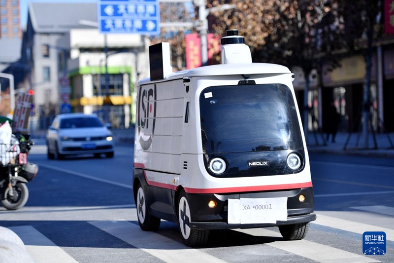 1月22日,無(wú)人駕駛配送車在派送郵件。新華社記者王曉 攝