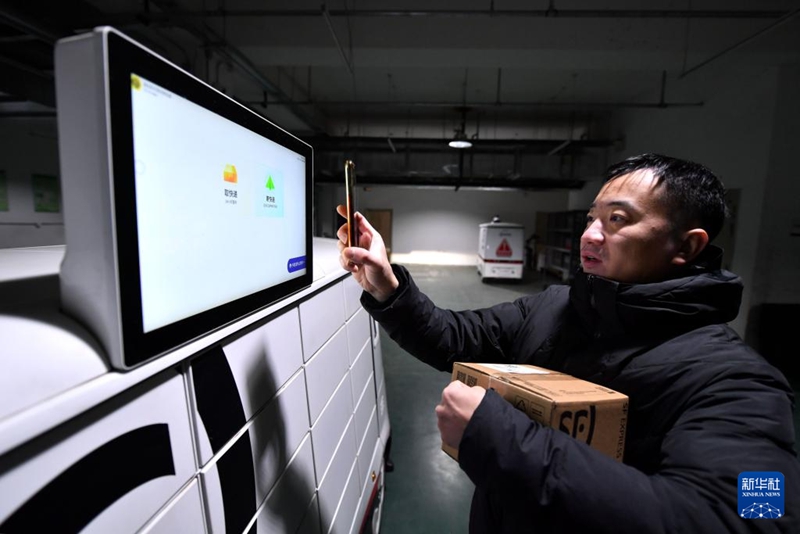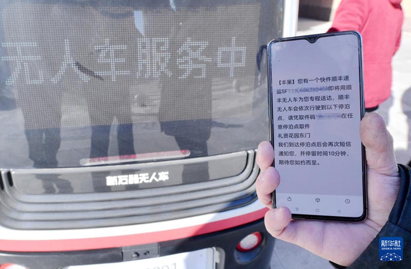 1月22日,居民收取無(wú)人駕駛配送車送來(lái)的郵件。新華社記者 王曉 攝