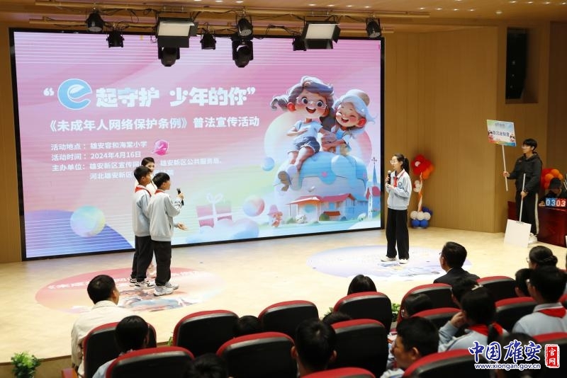 中國(guó)雄安官網(wǎng)4月17日電(甄星)《未成年人網(wǎng)絡(luò)保護(hù)條例》已于2024年1月1日施行。作為我國(guó)第一部專門性的未成年人網(wǎng)絡(luò)保護(hù)綜合立法,該條例對(duì)于健全未成年人網(wǎng)絡(luò)保護(hù)制度體系,保障未成年人合法權(quán)益具有重要意義。為進(jìn)一步提高未成年人網(wǎng)絡(luò)安全和個(gè)人信息保護(hù)意識(shí),提升未成年人網(wǎng)絡(luò)素養(yǎng),構(gòu)筑未成年人網(wǎng)絡(luò)安全屏障,4月16日,“e起守護(hù) 少年的你”《未成年人網(wǎng)絡(luò)保護(hù)條例》普法宣傳活動(dòng)在雄安容和海棠小學(xué)舉辦。該活動(dòng)由雄安新區(qū)宣傳網(wǎng)信局、雄安新區(qū)公共服務(wù)局和河北雄安新區(qū)中級(jí)人民法院聯(lián)合舉辦,共有200余名師生參加。
