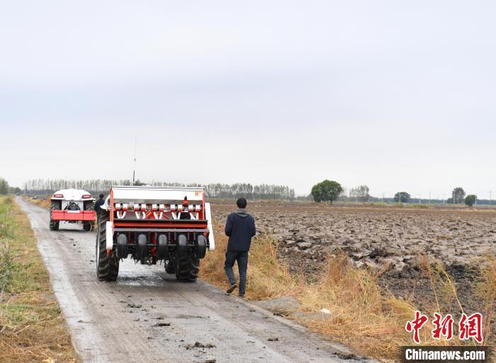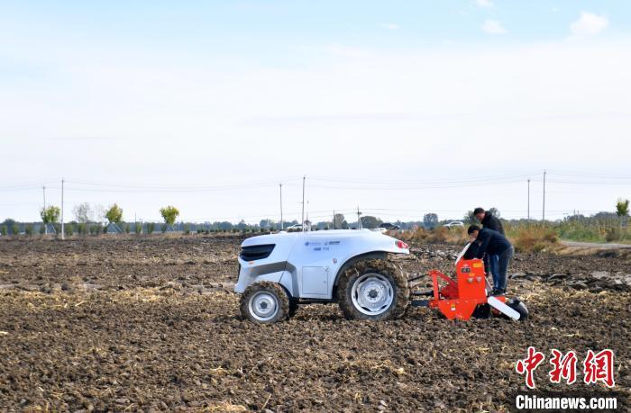 10月22日,河北雄安新區(qū)安新縣端村鎮(zhèn)關城二村一農(nóng)田內(nèi),“鴻鵠T70”電動智能拖拉機準備進行秋播作業(yè)。中新社記者 韓冰 攝