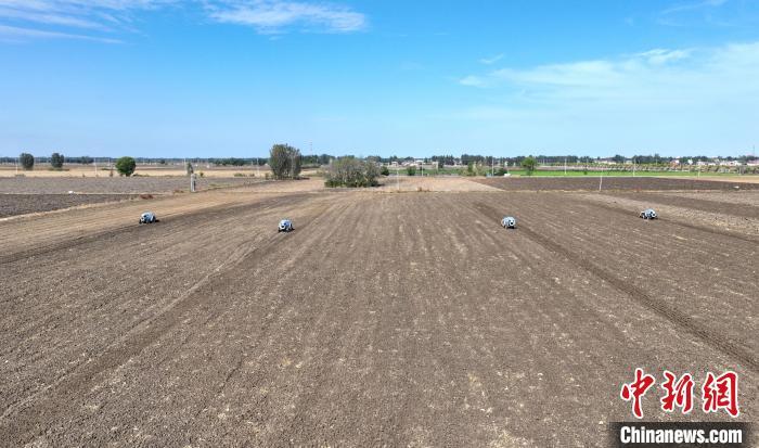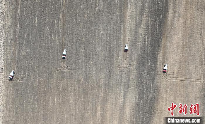 10月22日,河北雄安新區(qū)安新縣端村鎮(zhèn)關城二村一農(nóng)田內(nèi),幾臺“鴻鵠T70”電動智能拖拉機正在進行秋播作業(yè)。(無人機照片)中新社記者 韓冰 攝