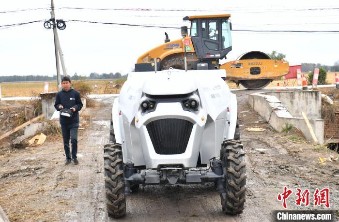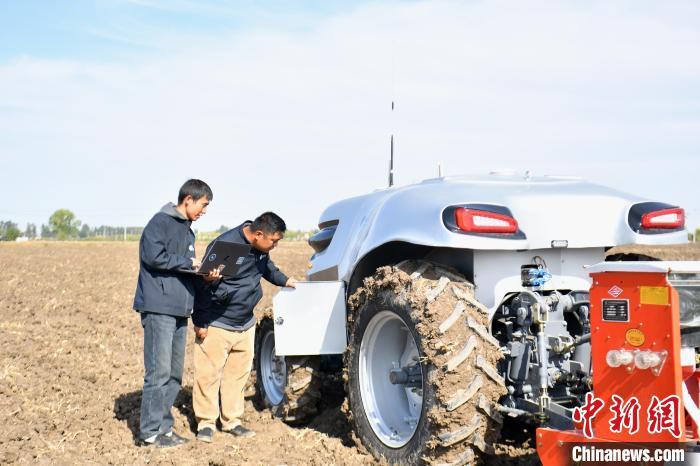 10月22日,河北雄安新區(qū)安新縣端村鎮(zhèn)關城二村一農(nóng)田內(nèi),工作人員對“鴻鵠T70”電動智能拖拉機進行秋播作業(yè)前檢測。中新社記者 韓冰 攝
