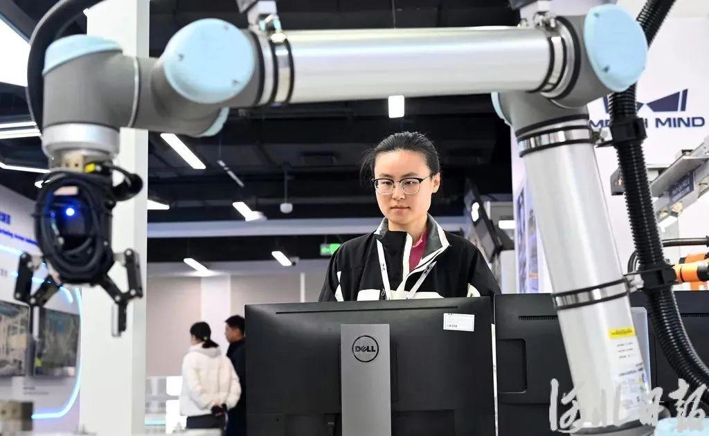 11月28日,雄安新區(qū)中關(guān)村科技園內(nèi),梅卡曼德工作人員為參觀者演示“AI+機(jī)器人”新產(chǎn)品。河北日報記者劉光昱 攝
