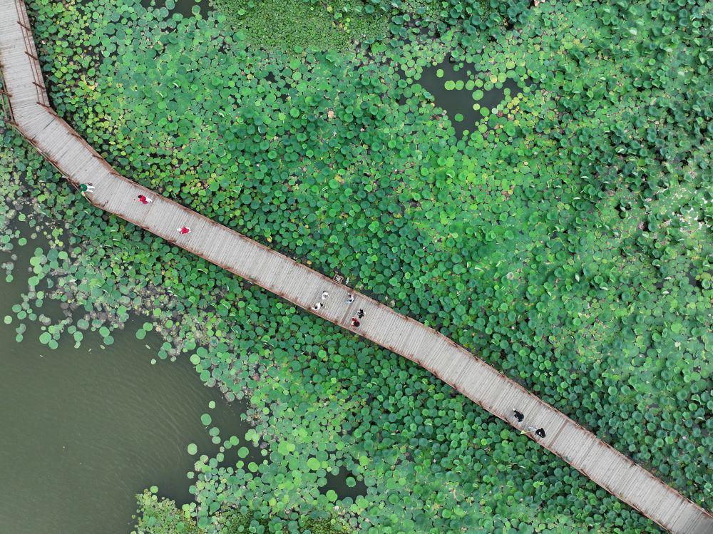 游人在雄安新區(qū)白洋淀荷花大觀園內(nèi)游覽(2024年7月9日攝,無人機(jī)照片)。新華社記者 牟宇 攝