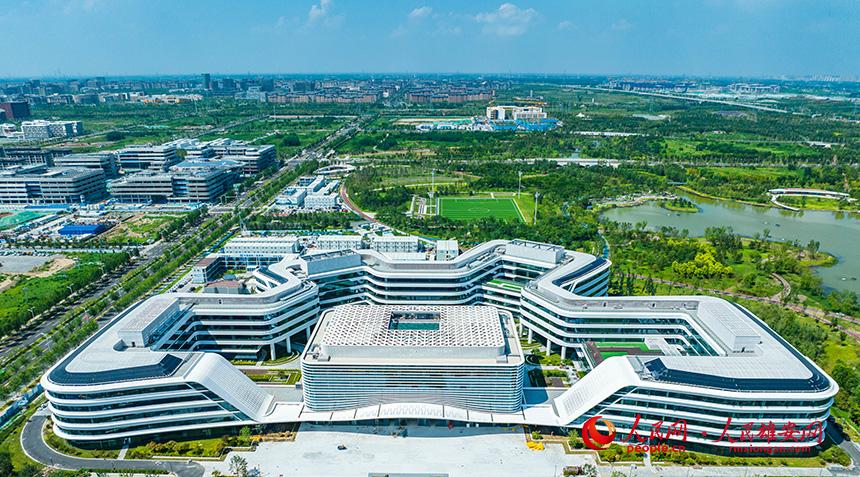 中國星網(wǎng)以四瓣之花為形,中心玉琮狀建筑承衛(wèi)星之韻,周邊飄帶環(huán)繞,繪就城市綠軸新畫卷,映照“花綻雄安,星耀華夏”。人民網(wǎng)記者 李兆民攝