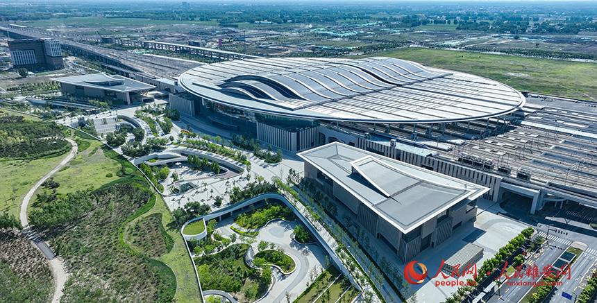 雄安高鐵站,從空中俯瞰,形似“青蓮滴露”,鑲嵌在雄安新區(qū)昝崗片區(qū)。人民網(wǎng)記者 李兆民攝